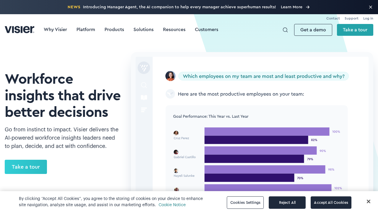 Visier is a workforce analytics and planning software focusing on AI-powered insights to deliver better people-related decisions. It emphasizes predictive modeling, workforce planning, and retaining talent using advanced data aggregation and analysis techniques.